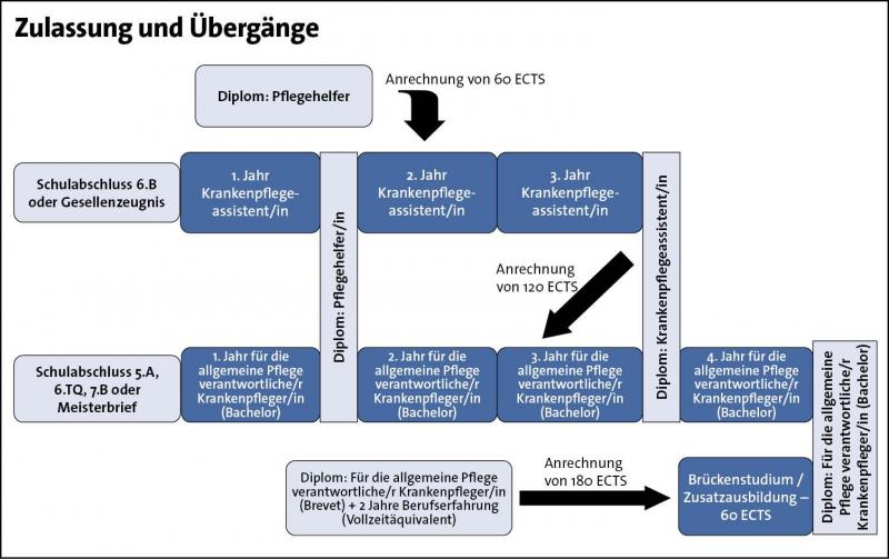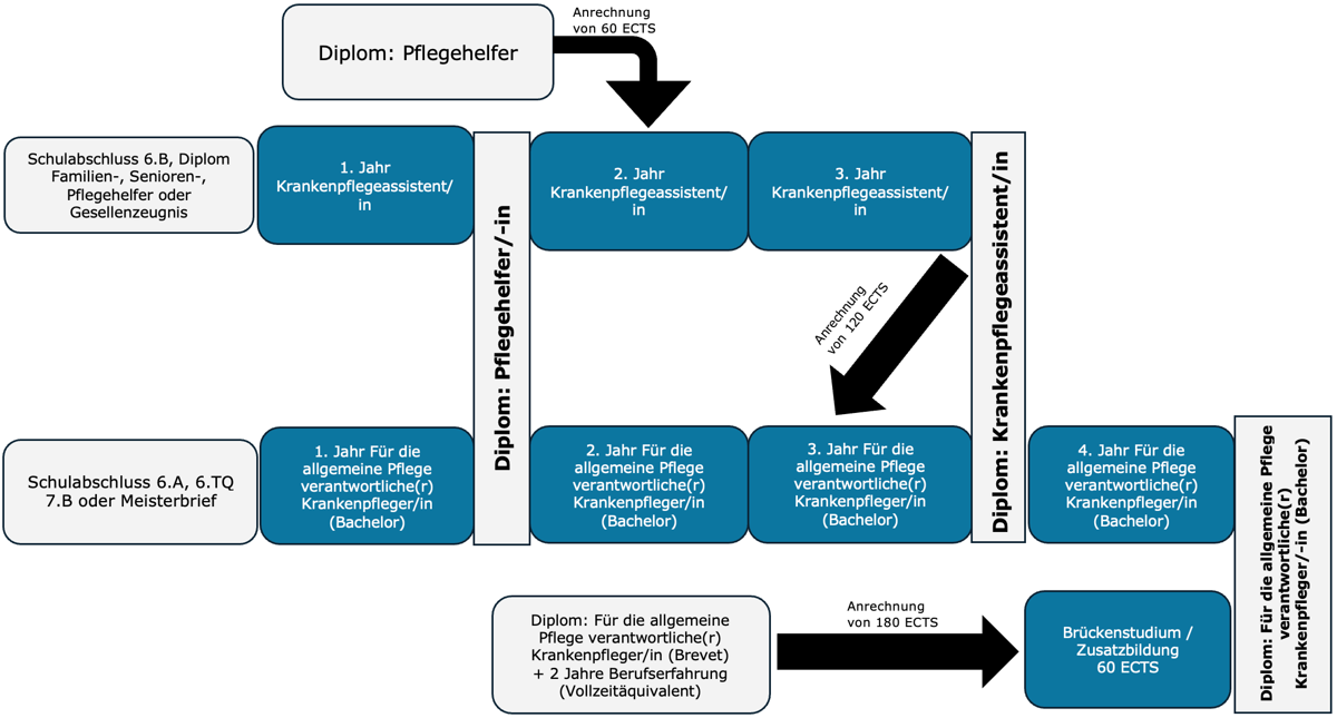 Die Neustrukturierung der Pflegeausbildung an der AHS ermöglicht neue flexible Bildungswege. Durch die klare Angabe des Ausbildungsumfangs in ECTS entstehen verschiedene Übergänge und Anrechnungsmöglichkeiten, die den Gedanken des lebenslangen Lernens unterstützen. Pflegehelfer/-innen können nach erfolgreichem Absolvieren eines Online-Kurses (Vertiefung der bereits erworbenen Kompetenzen auf das Niveau Krankenpflegeassistenz) und einer normativen Überprüfung mit 60 ECTS Anrechnung direkt in das zweite Ausbildungsjahr einsteigen. Diese verkürzte Form wird ab dem akademischen Jahr 2027/2028 angeboten. Ab dem akademischen Jahr 2029/2030 erhalten Absolventinnen und Absolventen der Krankenpflegeassistenz 120 ECTS-Anrechnung und können direkt in das dritte Studienjahr (5. Semester) des Bachelorstudiengangs „Für die allgemeine Pflege verantwortliche/-r Krankenpfleger/-in“ einsteigen. Fehlende Kompetenzen werden durch Zusatzmodule innerhalb der verbleibenden vier Semester erworben. Damit entsteht ein durchgängiger Karriereweg in der Pflege von der Pflegehilfe bis hin zu Master- oder Doktoratsstudien.